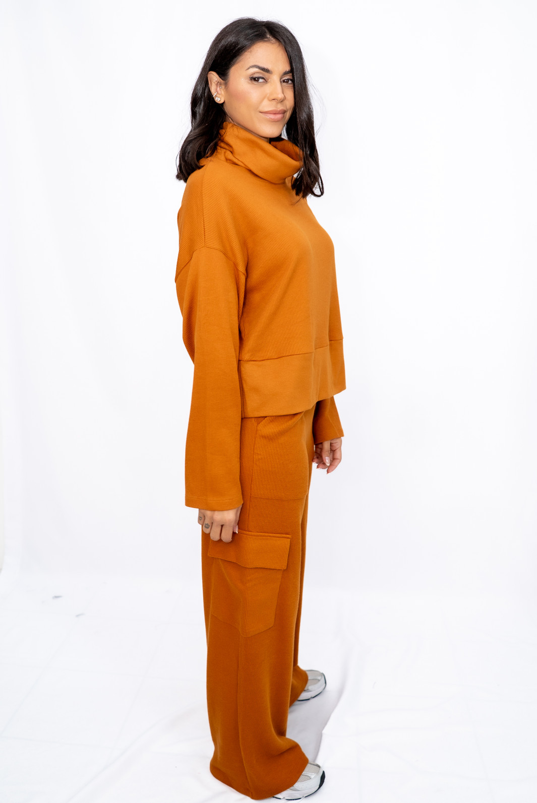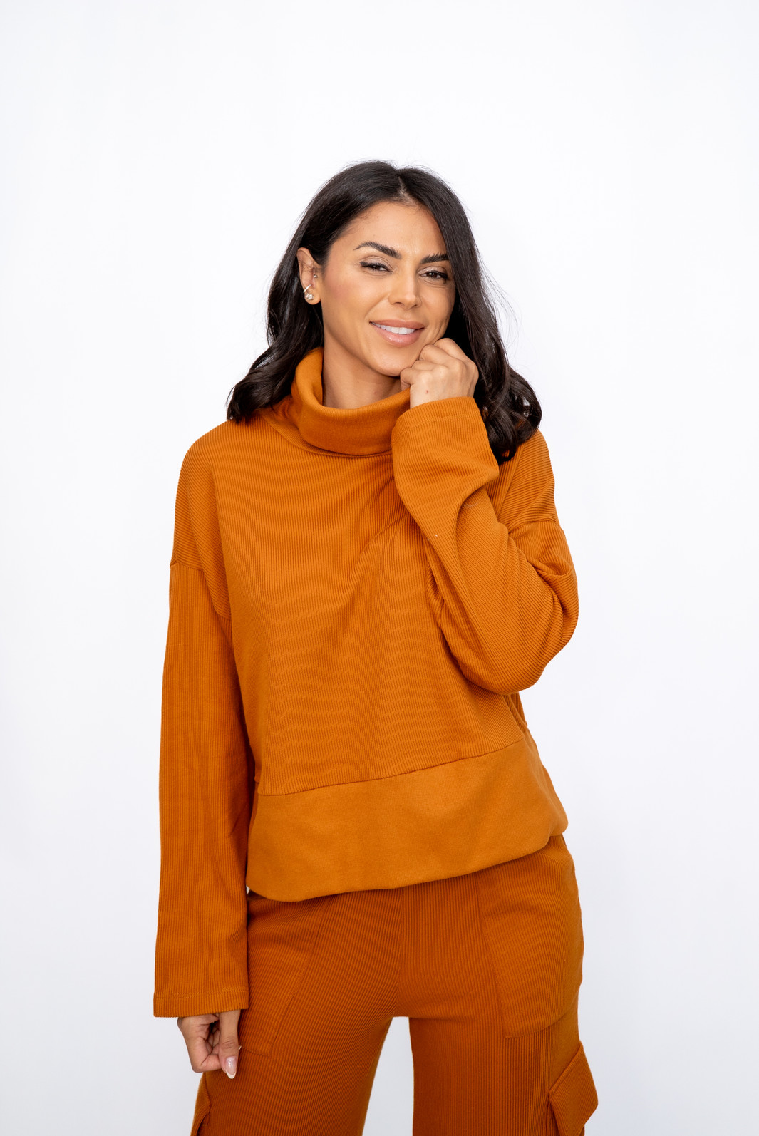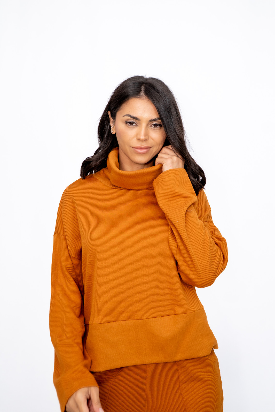 Blusa Malha Canelada Gola Alta Caramelo Ramo Selvagem