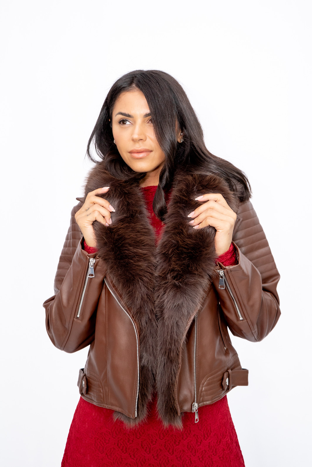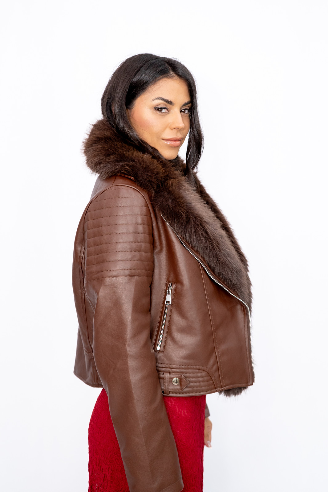 Jaqueta Curta PU Gola de Pelo Marrom