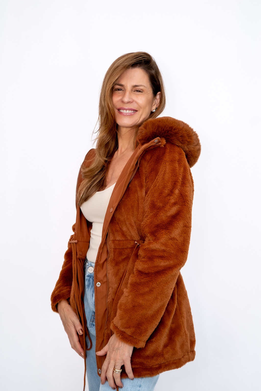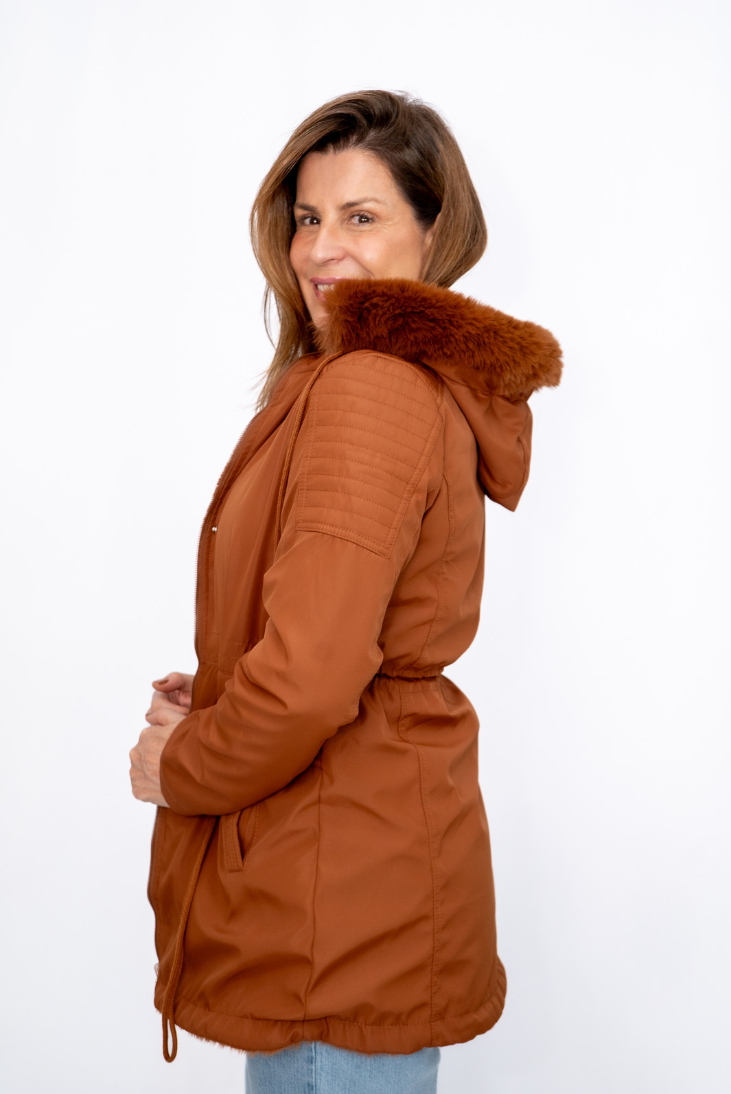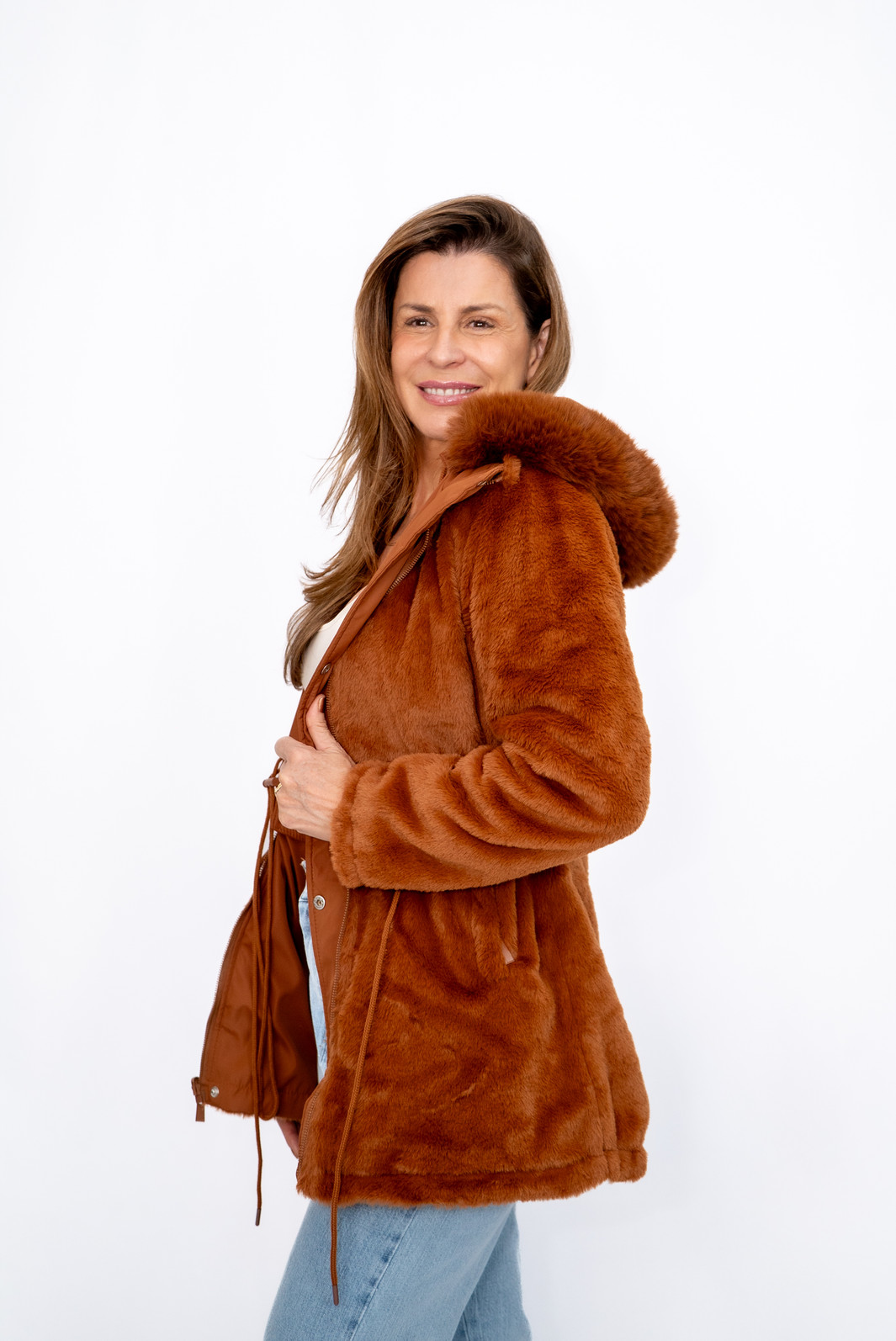 Parka Dupla Face Nylon e Pelo com Capuz Terracota
