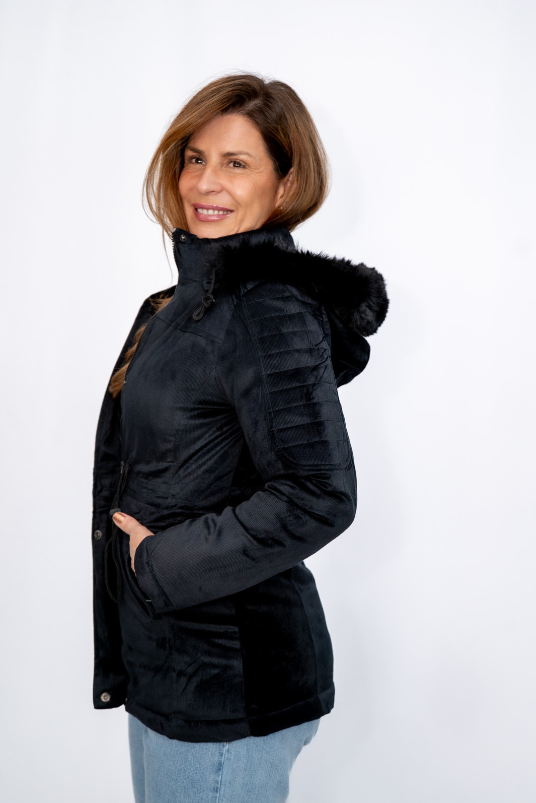 Parka Dupla Face Nylon e Veludo com Capuz Preta