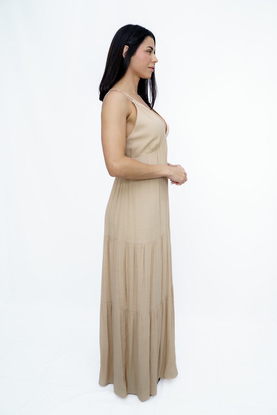 Vestido Longo Alças Finas Bege Ramo Selvagem