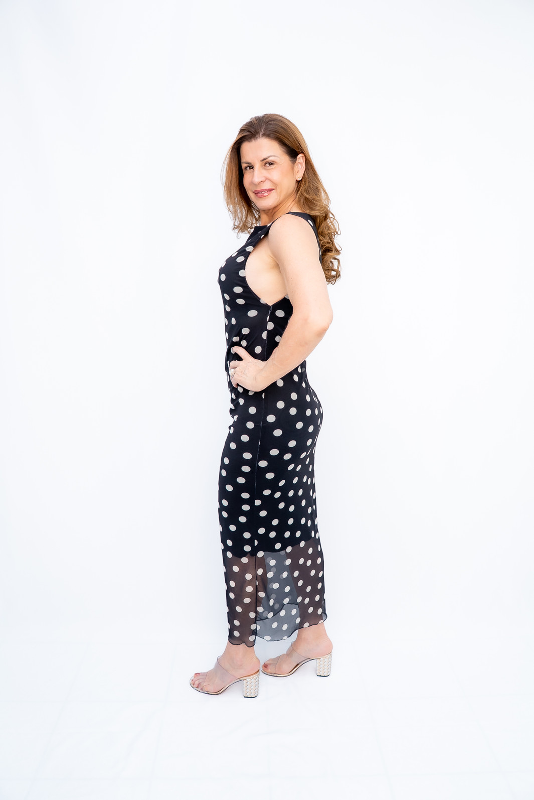 Vestido Longo Poa Franzido na Cava do Braço Preto