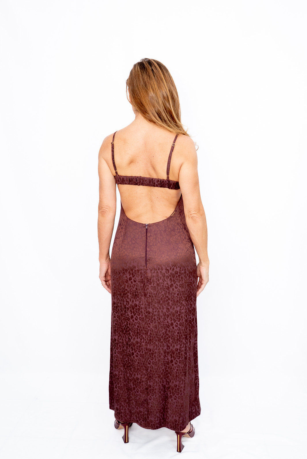 Início Vestidos Vestido Longo Tecido Trabalhado Animal Print Chocolate Bana Bana