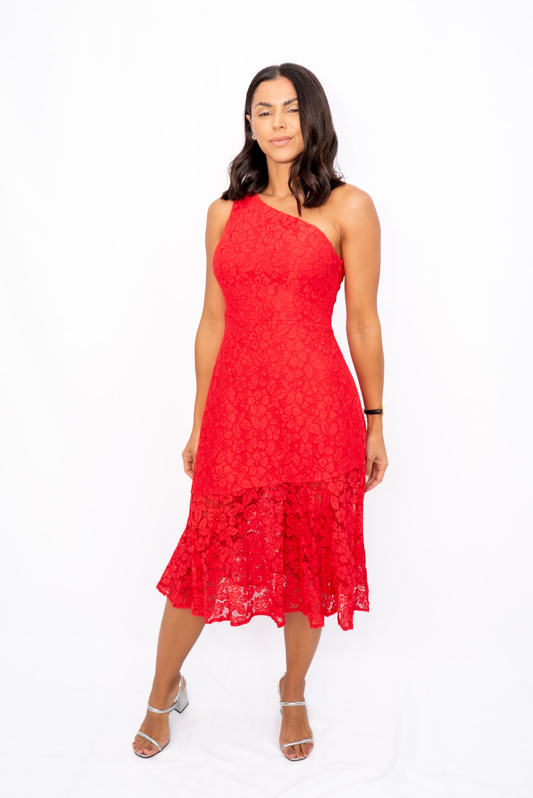 Vestido Midi Ombro Só em Renda Vermelho